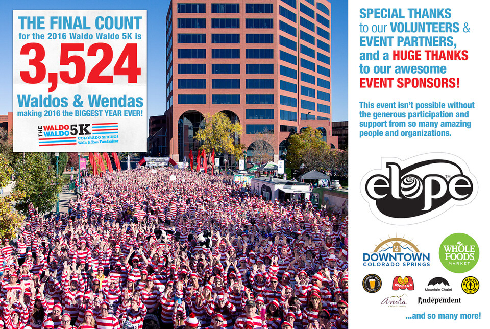 Thousands of Waldos and Wendas will take to the streets in downtown Colorado Springs, Saturday – October 22, 2016. Waldo Waldo is the region's most popular untimed 5K walk and fun run. Local exhibitors, music, and food trucks all added to the fun. Best of all, registered participants receive a Where’s Waldo costume kit. Money raised benefits local nonprofits that support community priorities like Waldo Canyon restoration and trail maintenance.
